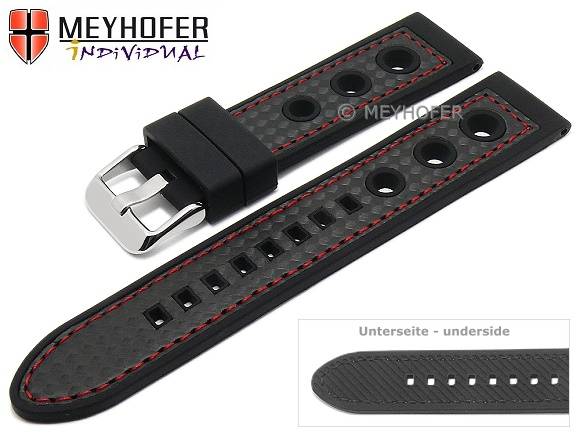 Watch strap "Tulsa" 24mm black silicone carbon optics racing look red stitching by MEYHOFER (width of buckle 22 mm)